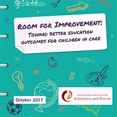 Room for Improvement: Toward Better Education Outcomes for Children in Care also recommends that the Ministry of Education strengthen accountability for the academic achievement of students in government care and that the Ministry of Children and Family Development (MCFD) ensure that children and youth in care are supported to recover from trauma so that its impact on their learning is reduced.